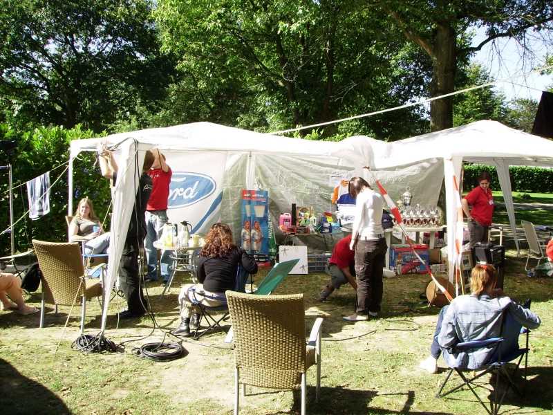 Tijd om de tentjes op te zetten. Ging niet bij iedereen van harte, haha. Ook het opzetten van de partytenten kosten nog wat improvisatie.. tie-ripjes enzo.. hihi.. Belgische kwaliteit noemen ze dat toch, Kristof?? Geintje!!