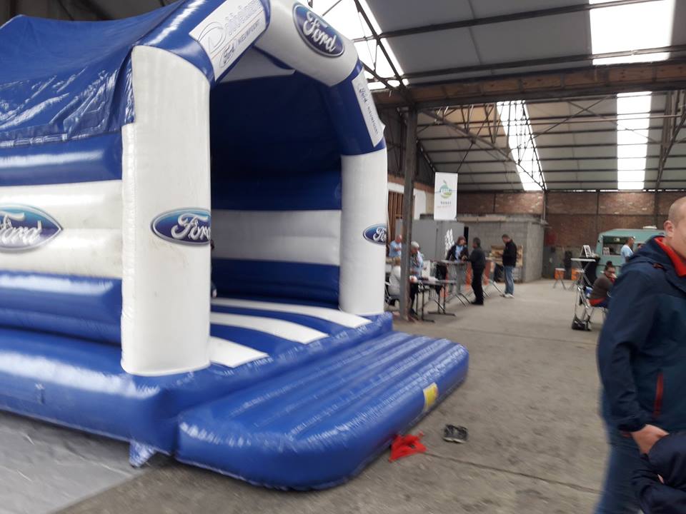 Gelukkig was er bij het meeting terrein een grote hal waar de organiserende club het gezellig gemaakt had. Bar, eet kraampjes,stands met Ford spullen, springkussen voor de kinderen, de stand t.g.v. 50 jaar Escort en het podium voor de prijsuitreiking.